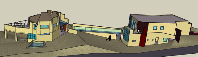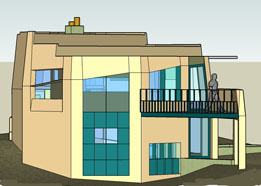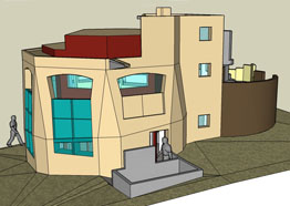 Breaking the spiral ramp apart, shifting the 2 pieces, and thereby creating openings in 2 places improves the flow of the circulation, and enlarges the landings at the entry and access to the deck on the second level. The form implies movement as opposed to the stationary aspect of the octagon, especially on the interior where the geometries would be less classical and more baroque. The deck on the south, however, casts too much shadow on the lower, solar-useful facade. But the glazing in this scheme somehow visually blends into the overall mass, making each element less attention-getting and more unifying.