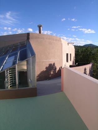 The greenhouse is a passageway from the house to the studio and to the roof terrace over the studio. It is, also, now the primary heating source for the house. 2 small PV panels under the glass drive a fan which transfers the warm air into the house; while not a perfect match the amount of heat trapped determines the of CFM delivered without the need for an electronic controller, and the need for extending a power source through the concrete wall. The double-pitch and the curved south wall, made this a difficult custom structure to build. The inner trusses are oriented on lines that intersect a hypothetical extension of the inside dome center point. The parts were cut from aluminum plate and L angle on site and fasten together with rivets and stainless screws. The pre-existing south facing wall of the house was painted a dark purple to better absorb the solar gain. The fan running under full sun can produce 1,000CFM of air delivery.